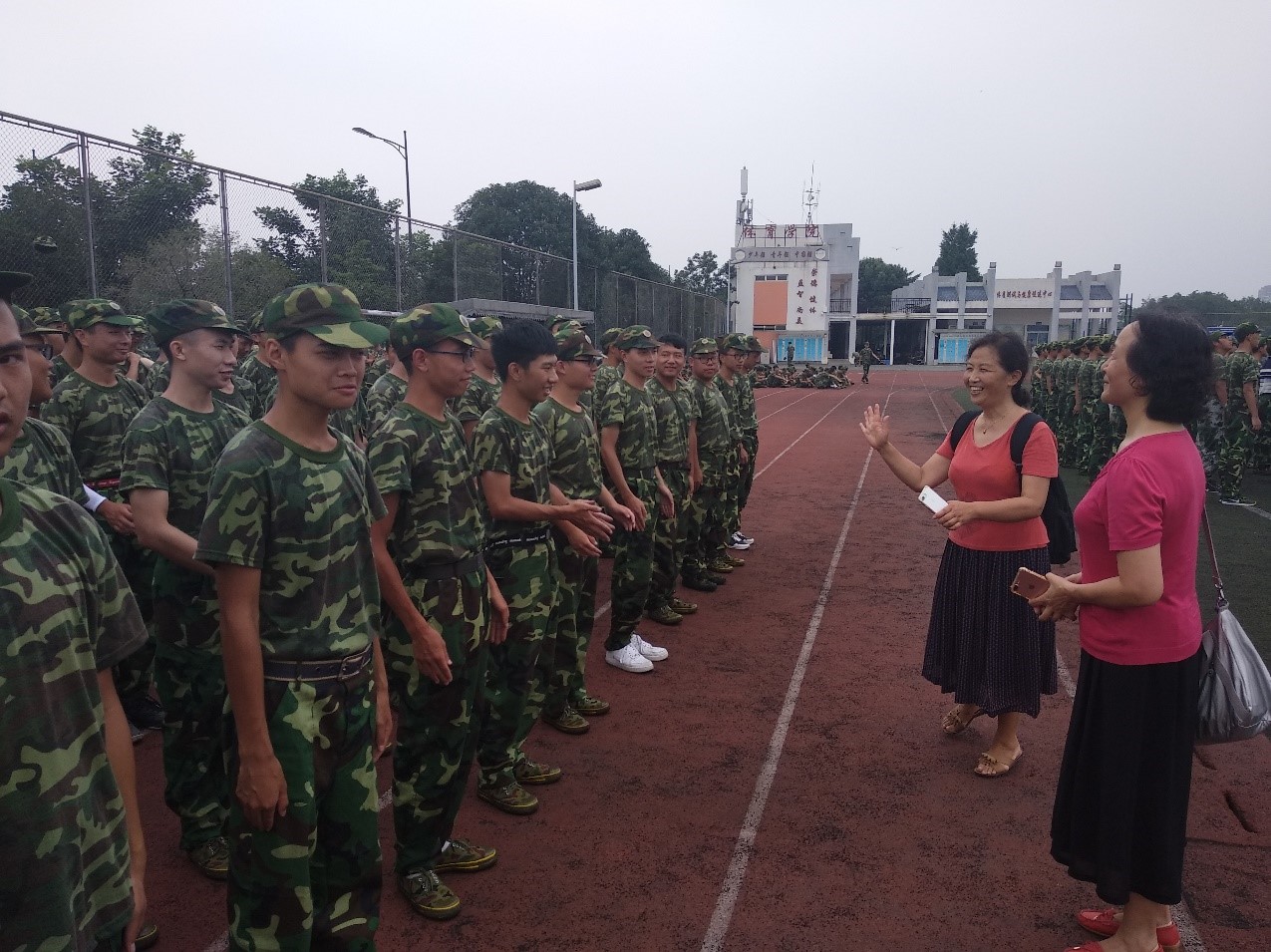 2018年7月19日下午4时,在学院17级辅导员喻可乐老师的陪同下,教导员李川娜、侯筑老师来到训练场地看望慰问2017级军训新生。