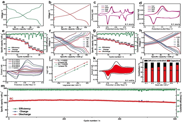 图2.a, b) O3-NaNM和O3-NaLNMCM在0.5C倍率下的恒流充放电曲线。c, d) O3-NaNM和O3-NaLNMCM在0.1mV/s下的循环伏安图。e-h) O3-NaNM和O3-NaLNMCM的倍率性能及不同倍率下的充放电曲线。i, j) O3-NaLNMCM在不同扫速下的循环伏安图和相应的线性合。k) O3-NaLNMCM在0.1mV/s的电容贡献。l) O3-NaLNMCM在不同扫速下的电容献。m) O3-NaLNMCM在5C倍率下的长循环性能。