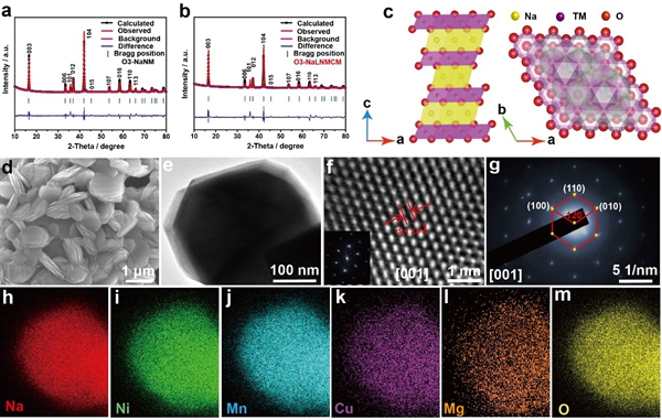 图1. a, b) O3-NaNM和O3-NaLNMCM的XRD精修图。c) O3型正极材料的晶体结构示图。d-m) O3-NaLNMCM的SEM,TEM,HR-TEM,SAED和TEM-EDS图。