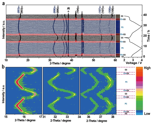 图4.a, b) O3-NaLNMCM电极在C/10电流密度下进行充放电过程的原位XRD图以及相应的二维等高线图。