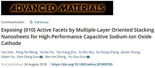 近日,学院新能源材料与器件课题组郭孝东副教授团队在钠离子电池研究方面取得突破性进展。相关研究成果“Exposing {010} Active Facets by Multiple-Layer Oriented Stacking Nanosheets for High-Performance Capacitive Sodium-Ion Oxide”发表于国际顶级期刊Advanced Materials(影响因子21.950)上。该论文第一作者为四川大学best365中国官方网站2016级博士研究生肖遥,best365中国官方网站为第一单位。