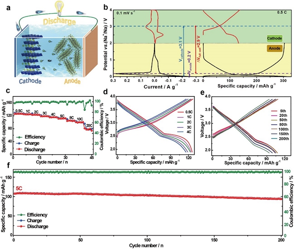图5. a) O3-NaLNMCM与硬碳组成全电池的放电示意图。b) O3-NaLNMCM与硬碳的循环伏安和恒流充放电曲线。c, d)全电池的倍率性能及相应的充放电曲线。e, f)全电池在5C倍率下的循环性能及不同循环次数的充放电曲线。