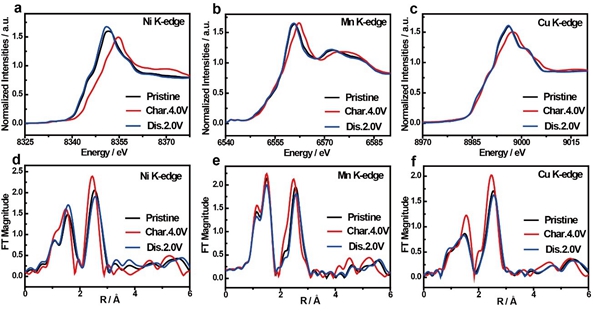 图3. a-c) O3-NaLNMCM的Ni-K edge, Mn-K edge, Cu-K edge的X射线吸收近边结构(XANES)。