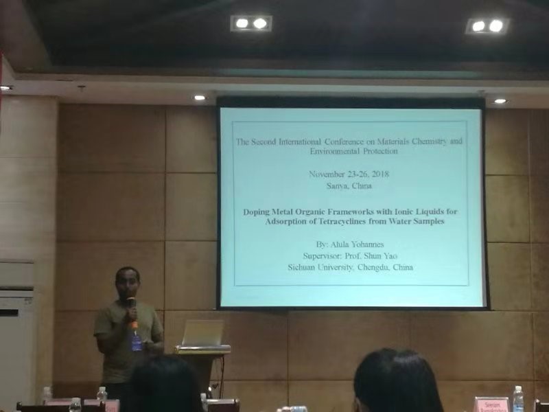 2018年11月23日~11月25日,第二届材料化学及环境保护国际会议(2ndInternational Conference on Materials Chemistry and Environmental Protection)于中国三亚顺利召开。我院制药工程专业三年级博士研究生Nigussie Alula Yohannes(埃塞俄比亚籍)出席该会议并于大会上作题为“Doping Metal Organic Frameworks With Ionic Liquids For Adsorption Of Tetracyclines From Water Samples”的研究报告。本次会议吸引了众多来自材料化学、分离科学、化学工程及环境工程等不同研究领域的研究员、科学家、工程师和学者,是我院学子和国内外相关领域专家面对面交流的难得机会。埃塞俄比亚被称为“东非水塔”,但普遍存在的污染问题尚未得到有效控制;环境水资源中的药物残留一直是影响和危害埃中两国乃至全球大众生命健康的重要问题,该研究立足化学工程领域的学科热点,将金属有机骨架材料与绿色溶剂离子液体相结合,为埃中两国代表性的河流湖泊样本建立了科学、有效、可行的四环素类成分回收新方法,具有显著的社会意义和研究价值。