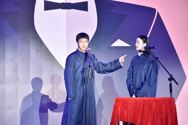 接着晚会进入了第二篇章“成长 创新”。激昂的钢琴声响起,架子鼓完美配合,小提琴也加入了,交响乐表演《Flower Dance》让观众沉醉在悠扬的乐声中。随后是歌曲演唱《想把我唱给你听》,两位歌手甜美的声音把故事温柔地诉说。接着精彩的相声表演《成功人士》博得观众轻松一笑,为大家重新定义了成功人士的概念。随后吉他声悠扬响起,歌唱者缓缓唱着带来一首《男孩》,全场都沉浸在了他们的歌声里。第二篇章结束后,主持人邀请了18级的两位辅导员老师进行第二轮抽奖,又有四位化工锦鲤诞生,引得观众席一片艳羡。