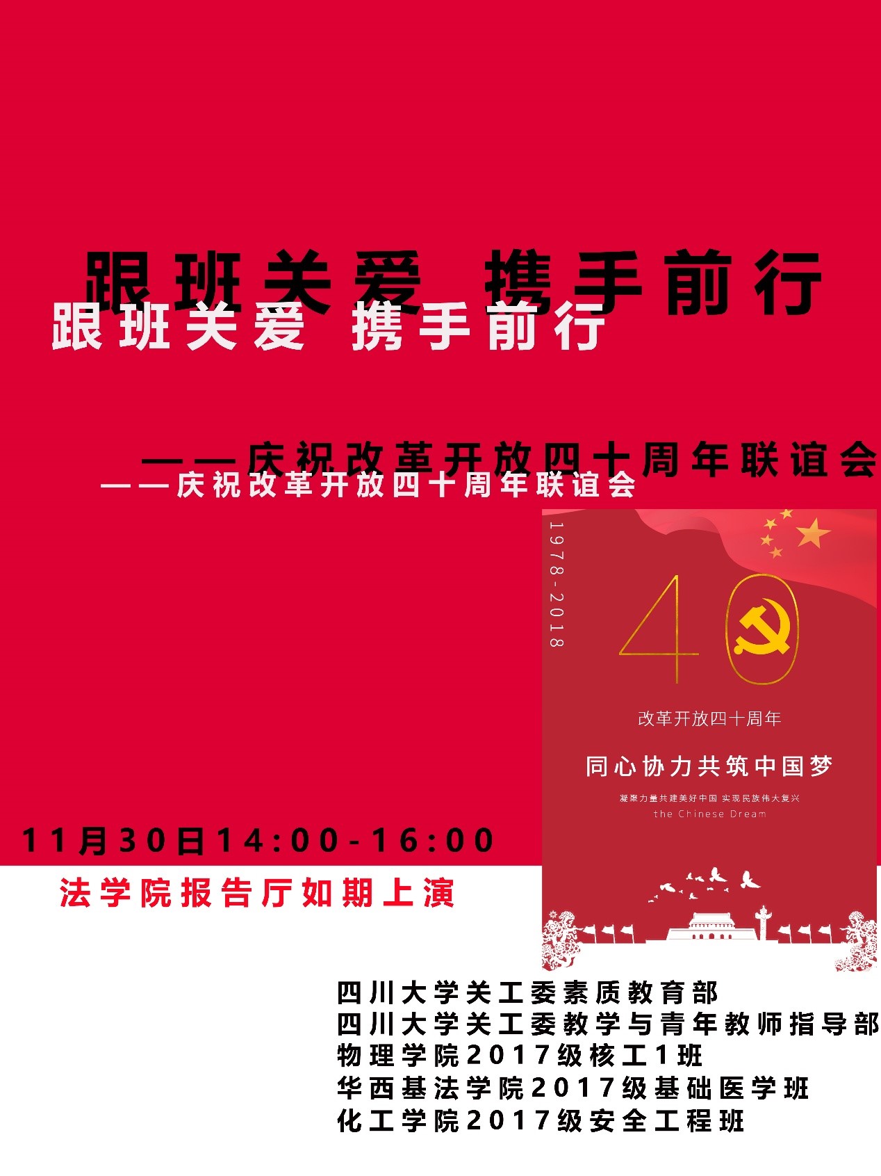 2018年11月30日星期五,由四川大学关工委素质教育部、四川大学关工委教学与青年教师指导部、best365中国官方网站2017级安全工程班、物理学院2017级核工1班、华西基法学院2017级基础医学班联合举办的跟班关爱活动,于四川大学法学院报告厅顺利举行。校关工委常务副主任唐登学老师、校关工委副主任周荣丰老师、办公室主任任朝清老师、物理学院党委副书记张波老师以及校关工委的老师们莅临此次活动,17级安全工程班、核工1班和基础医学班同学积极参与此次联谊会汇演。