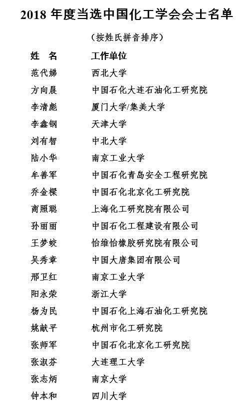 近日,在北京召开的中国化工学会40届二次理事会上,中国化工学会2018年度首批会士授予仪式隆重举行。中国化工学会理事长、中国石油化工集团公司董事长、党组书记戴厚良院士宣布了2018年度中国化工学会会士授予决定,四川大学杰出教授钟本和等全国20位在化工领域做出卓越成绩和为学会作出突出贡献的会员当选为中国化工学会会士(详情见下图)。