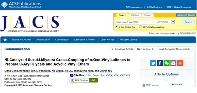 近日,四川大学钮大文教授课题组在糖类化合物合成上取得了新突破。相关成果“Ni-Catalyzed Suzuki-Miyaura Cross-Coupling of α-Oxo-Vinylsulfones to PrepareC-Aryl Glycals and Acyclic Vinyl Ethers”发表在国际顶级期刊《J. Am. Chem. Soc.》(影响因子14.357)。龚量博士和孙洪宝博士为该论文共同第一作者,钮大文教授为通讯作者。