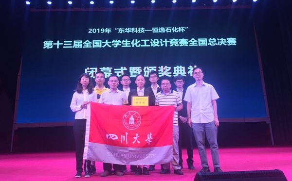 第十三届“东华科技—恒逸石化杯”全国大学生化工设计竞赛全国总决赛于2019年8月18—23日在中北大学举行。经过2天的专项评审,2天时间竞赛答辩,四川大学“SCU超越队”不惧强敌,凭借完善的作品,高质量的设计文档、娴熟的专业软件应用,清晰流畅的现场答辩,从60支总决赛的队伍脱颖而出,在死亡之组中杀出重围挺进第二轮,最终斩获全国总决赛特等奖,这是我院2012年以来连续8年获得全国特等奖的殊荣。
