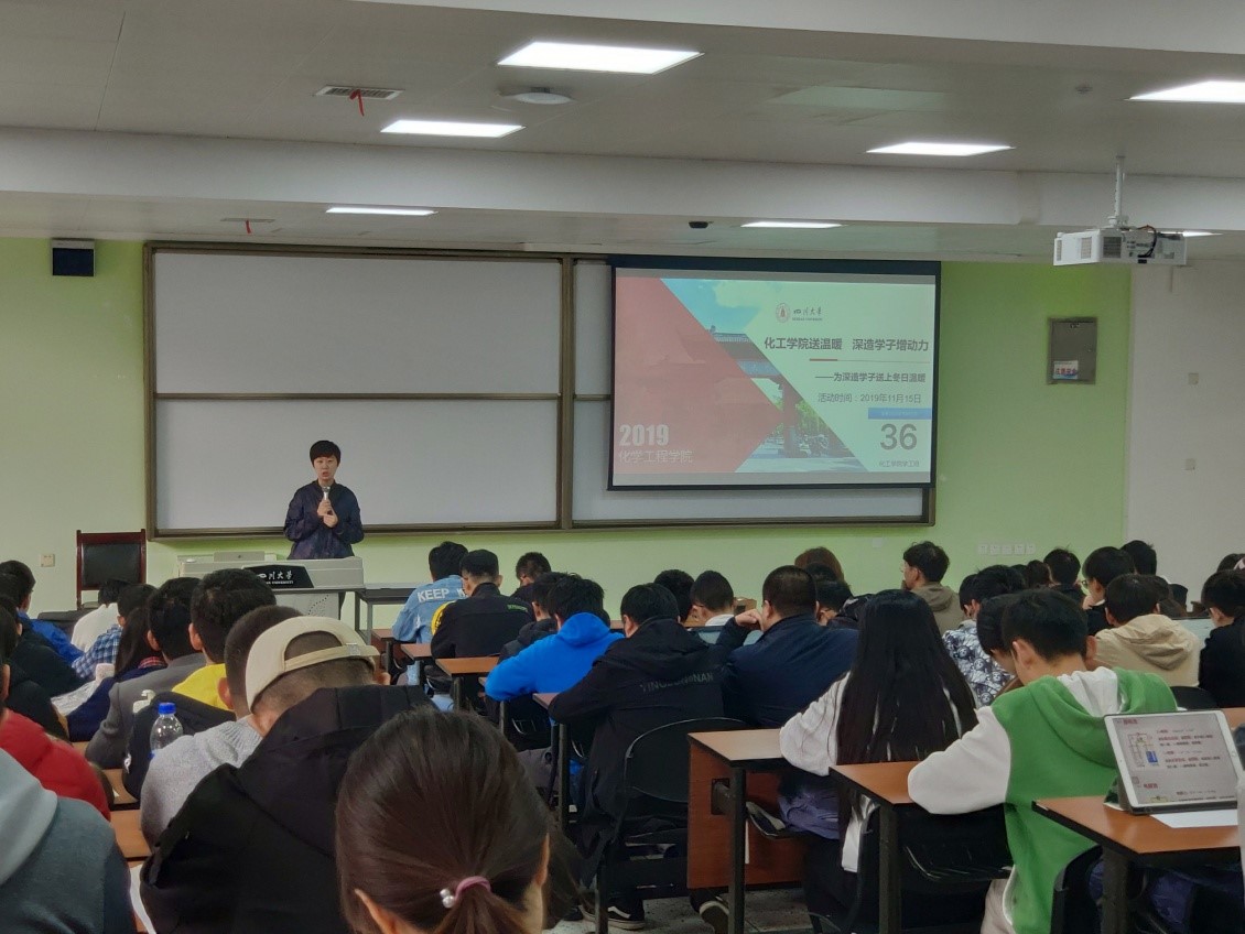 2019年11月15日中午1点,“化工学院送温暖 深造学子增动力”活动在江安校区一教楼B103成功举办,化工学院党委副书记姜利寒,辅导员王苏宁,兼职辅导员周建军、李银桥为best365中国官方网站2016级所有考研和出国留学的深造学子加油鼓劲、送去温暖。