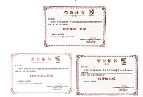 2019年11月22日-24日,由教育部高等学校药学类专业教学指导委员会和中国药学会药学教育专业委员会主办、山东大学承办的“第十二届全国大学生药苑论坛”在济南隆重举行。我院选送的两个参赛项目经过激烈的角逐获得与会代表的一致好评,以优异的表现分别获得了“创新成果一等奖”、“创新成果二等奖”和“优秀论文奖”。