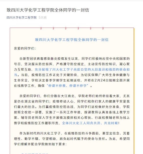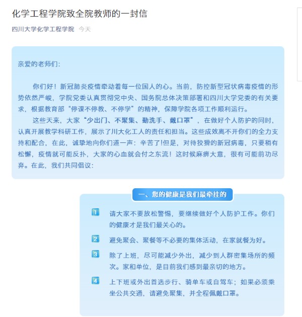 学院党委和学院工会坚决贯彻执行习近平总书记关于新型冠状病毒感染肺炎疫情防控工作重要指示精神和党中央、国务院决策部署,按照教育部、四川省有关要求和《四川大学防控新型冠状病毒感染的肺炎疫情工作方案(试行)》,积极配合学校做新型冠状病毒防控工作安排,保证学院师生健康和维护正常工作秩序。