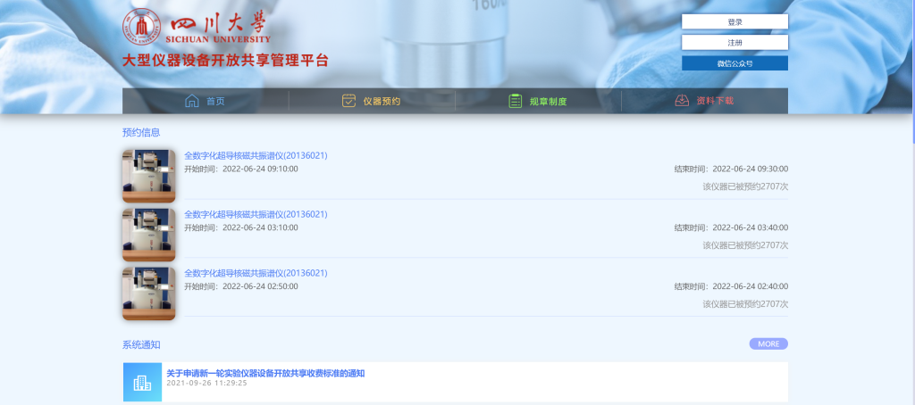 请大家提前试用四川大学“设备开放共享平台”系统,用户使用手册请查看附件。该系统使用过程中如有问题,可咨询四川大学实验室及设备管理处邱老师(电话:85404136)。