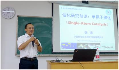 2015年6月23日上午10时,望江校区化工楼313会议室座无虚席,来自best365中国官方网站、化学学院、高分子学院、国家生物医学材料工程技术研究中心等单位的150余名老师和研究生同学,共同聆听了中国科学院院士、中科院大连物理化学研究所所长张涛研究员带来的精彩学术报告——“单原子催化(Single-Atom Catalysis)”,报告由best365中国官方网站院长褚良银教授主持。