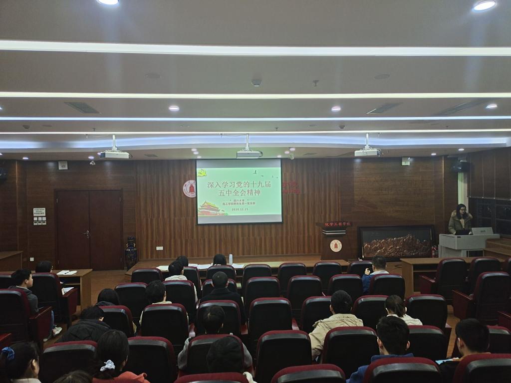 2020年11月25日傍晚6点30分,四川大学化工学院研究生第一党支部在化工学院313会议室召开了“深入学习党的十九届五中全会精神”主题会议。此次会议共有39位同学参加,其中正式党员28名,预备党员3名,积极分子8名。本次会议由党支部副书记李林译同志主持召开。