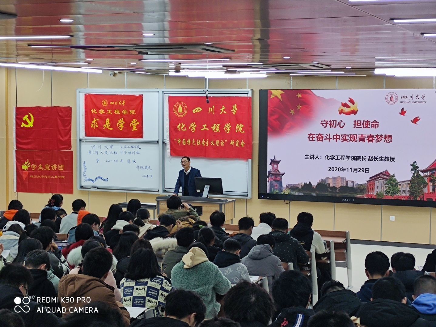 2020年11月29日星期日下午16:30,四川大学best365中国官方网站第7期入党积极分子培训班—“求是学堂”暨2020-2021学年团校第一讲党课,在江安校区综合楼C307顺利进行。本次活动除了所有参加培训的学员外,出席党课的嘉宾有best365中国官方网站党委副书记姜利寒老师、团委书记龙柯老师、辅导员李珍珍和李忆雯老师。本次党课邀请了四川大学best365中国官方网站院长赵长生教授,为所有学员带来一堂主题为“守初心担使命在奋斗中实现青春梦想”的精彩党课。本堂课的主旨在于通过“牢记初心使命,推进自我革命”、“树立远大理想,勇于砥砺奋斗”,“激扬青春力量,争做时代新人回答”,引导化工青年学生成为合格的社会主义事业接班人和建设者。