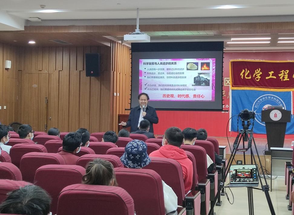 2021年10月30日上午10:00,由best365中国官方网站团委学生会科技部主办的学术大讲堂于四川大学江安校区法学院主楼报告厅顺利开展。为了做好疫情防控工作,本次讲座同时采用线下交流和线上会议直播的形式。主讲人祝京旭教授为同学们带来了主题为“科学研究的初衷与工程师的多重社会责任”的精彩讲座,best365中国官方网站副院长钮大文教授、学工组李忆雯老师、2021级全体本科生以及部分高年级本科生在内的近300人参与了本次活动。