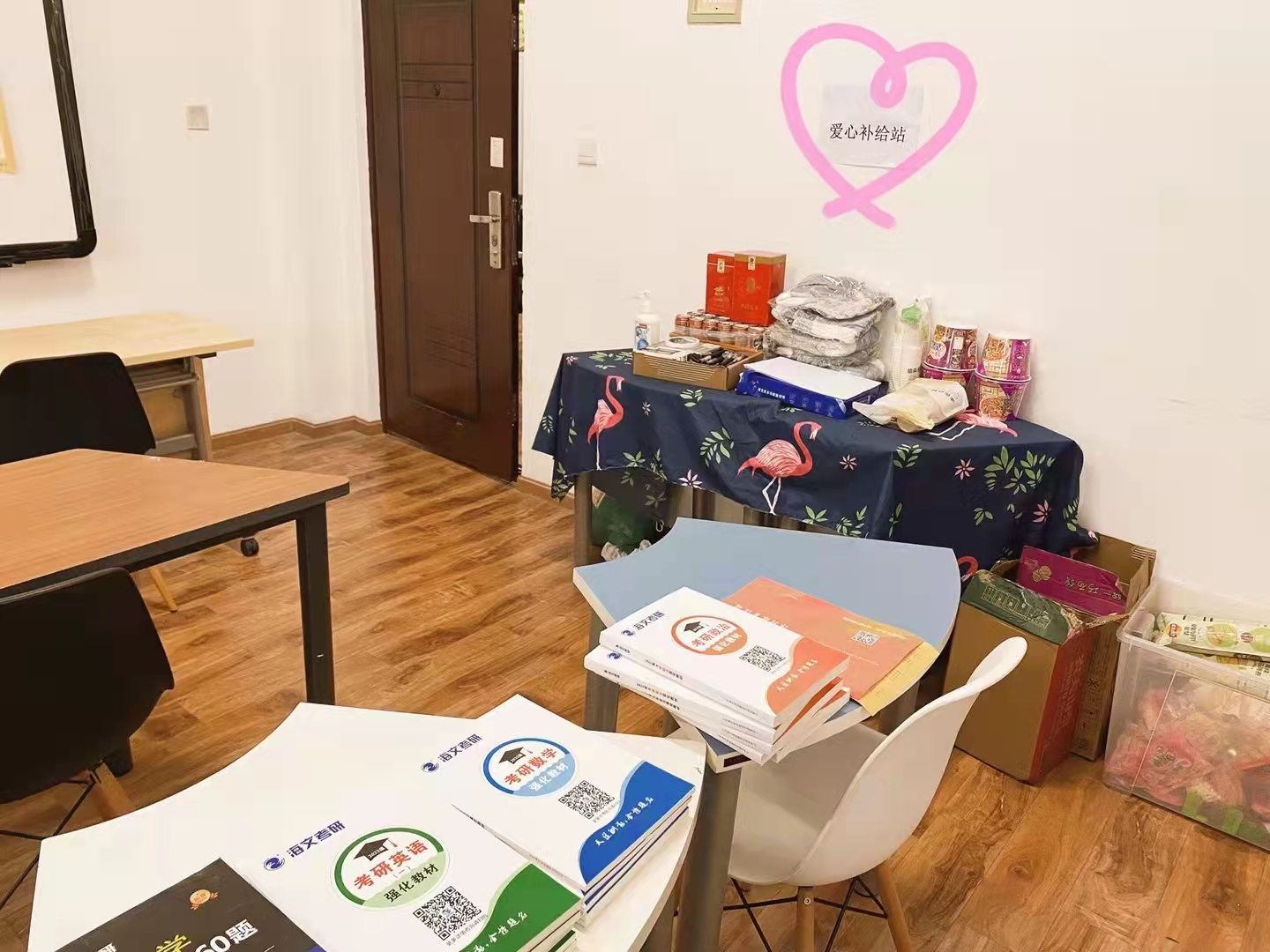 迎着初升的太阳,四川大学江安校区西苑三舍的活动室变得明亮起来,考研备考的同学们开始了他们忙碌而充实的一天。这是一间特别的“社区自习室”,室内有空调、热水、网课多媒体设备、整齐的桌椅、以及日常的学习用品和食物填满的“爱心补给站”,旨在为化工的考研学子提供便利、舒适、温暖的一站式学习环境,让同学们可以心无旁骛地专心学习,摆脱冬日气温低、图书馆占座不易等烦恼,全力冲刺理想的学校。