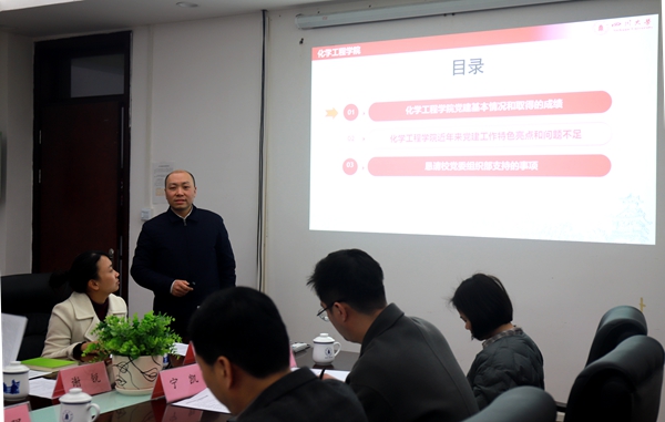 学院党委书记李天友向黄园常务副部长一行汇报了学院党建工作情况。他说到,best365中国官方网站党委在学校党委坚强领导下,在党委组织部有力指导下,深入学习贯彻习近平新时代中国特色社会主义思想和党的十九大及十九届历次全会精神,坚持以党的政治建设为统领,团结带领学院全体师生做到“爱党爱国、立德树人、敢为人先、攻坚克难、发展至上”,做好把方向、定政策、促改革、抓发展、保落实有关工作,有力推进党建与事业融合发展,学院党建和一流学科建设取得可喜成绩。李天友重点介绍了学院党建“1347”的特色做法。对于今年的党建工作,李天友说到,学院全体师生将深入学习贯彻习近平新时代中国特色社会主义思想和党的十九届六中全会精神,做“两个确立”的坚决拥护者和“两个维护”的坚定践行者,把方向、强学习、紧联系、保落实,坚定务实作风,大力解决影响发展的主要矛盾和矛盾的主要方面,聚焦立德树人根本任务,对标学校“三高”目标,切实提升办学水平,努力建设一流化工学科。