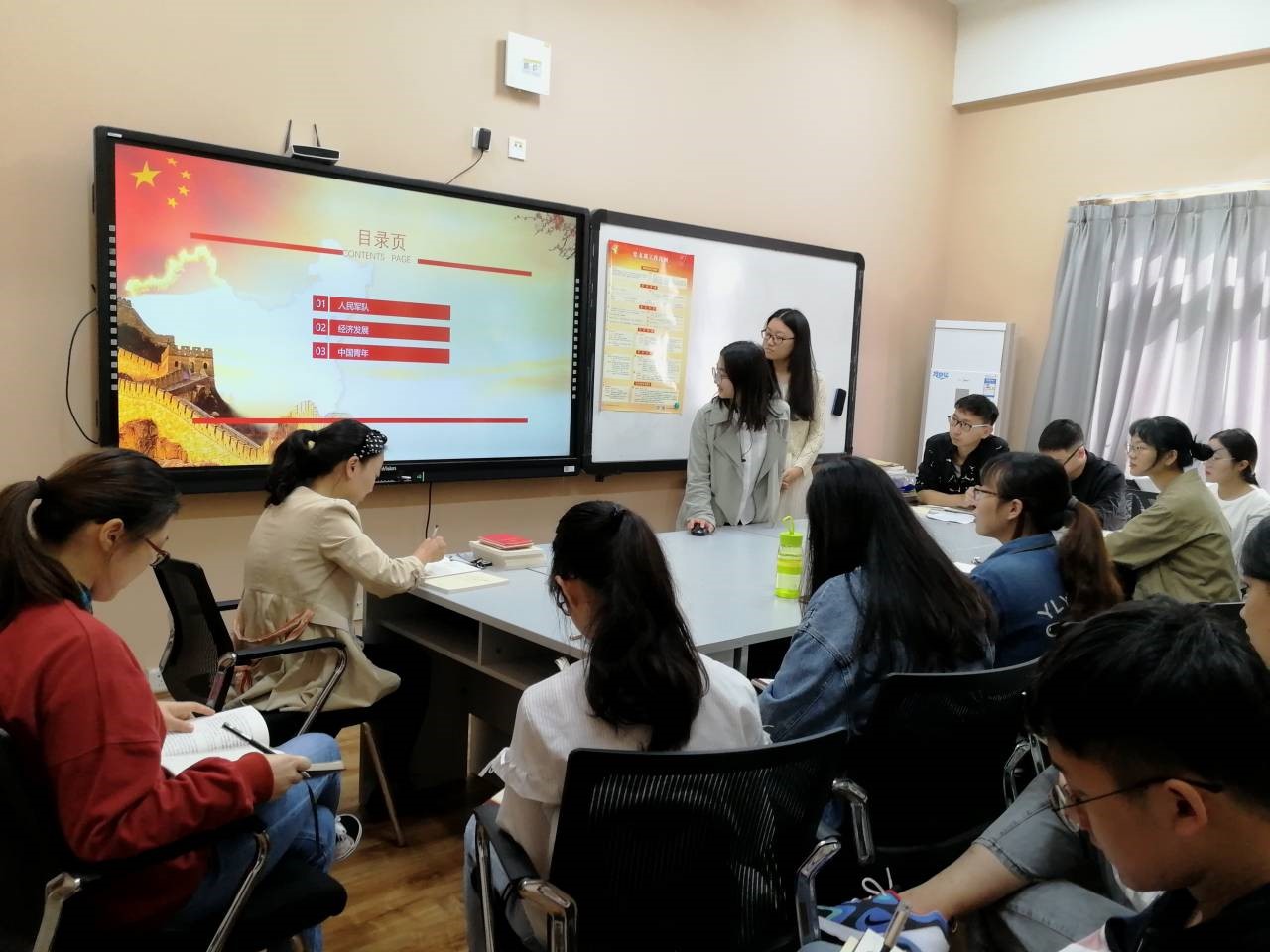 图2.匡悦和杨婧钰同志分享《习近平关于“不忘初心,牢记使命”论文摘编》前三章内容