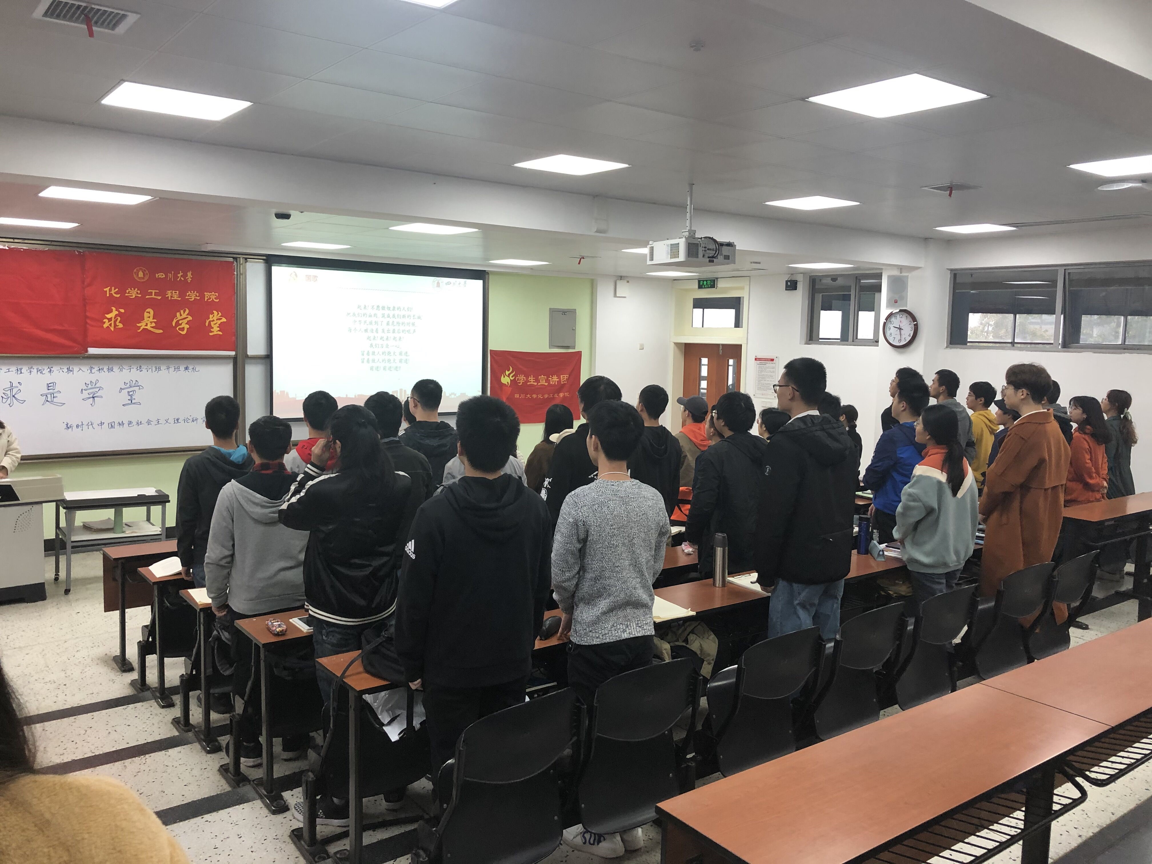11月16日上午九时三十分,best365中国官方网站“求是学堂”第六期入党积极分子培训班开班典礼准时开始。首先进行典礼第一项流程,全体起立奏唱国歌。接着进行典礼第二项流程,由主持人介绍与会嘉宾,他们分别是四川大学best365中国官方网站党建指导教师李珍珍,best365中国官方网站优秀博士生代表罗杰。