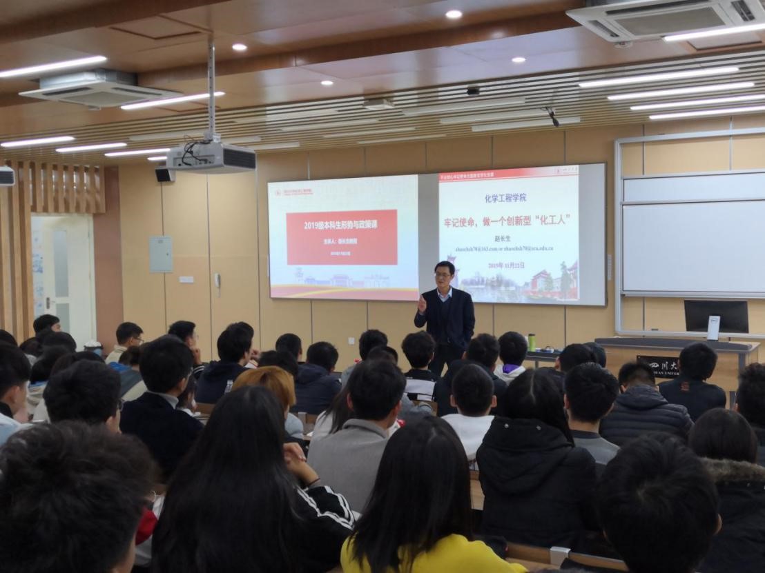 在介绍了四川大学化工学院的历史发展与专业分布之后,赵院长从化工这一学科面临的机遇与挑战入手,对同学们未来的学习之路提出了几条建设性意见。首先是要树立自己远大的理想和目标,找准自己的专业方向,他鼓励同学们继续深造,攻读硕士或博士,解决化工领域卡脖子的关键技术问题;其次要懂得感恩,感恩父母、感恩老师、感恩学校、感恩国家,懂得感恩,才能肩负社会责任;最后就是要努力奋斗,掌握好专业技术,练就专业本领。