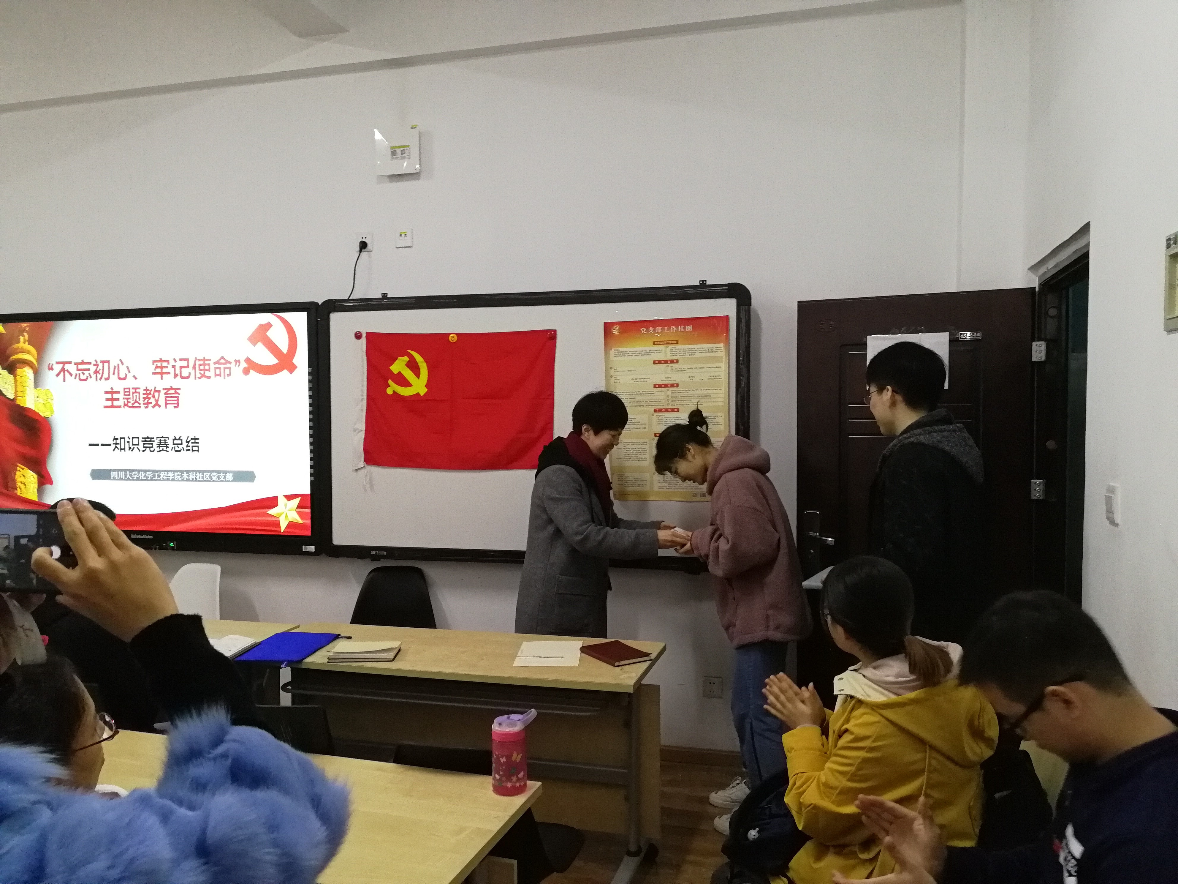 11月29日,best365中国官方网站本科社区党支部在江安校区三舍活动室举行庆祝“不忘初心 明确责任担当,牢记使命 争当优秀党员”的知识竞赛颁奖仪式。best365中国官方网站党委副书记姜利寒老师以及获奖支部代表、获奖个人参加了颁奖仪式,本次颁奖仪式由本科社区党支部书记李珍珍老师主持。