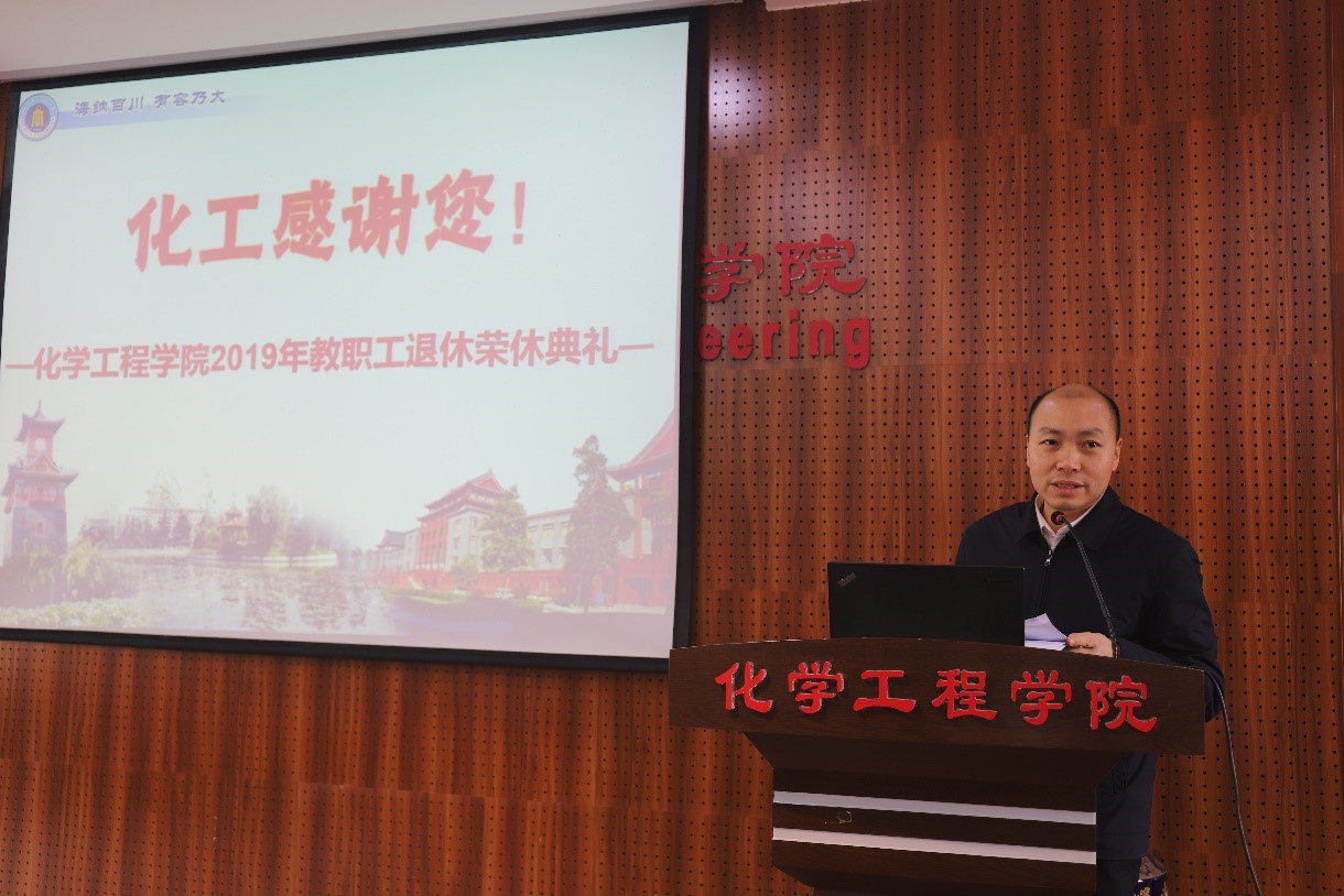 大会第一项议程,举行近两年退休教职工荣休典礼。学院党委书记庞国伟同志代表学院党委致辞。庞书记首先对最近两年退休的教师送上真挚的祝福,并表达崇高的敬意。他说到,教师荣休,无论是对教师本人,还是对学院,都是一件大事。对教师来说,荣休是对过去从教生涯的总结和肯定,也是教师事业发展值得骄傲的时刻和荣誉。对学院来讲,荣休教师将青春和智慧留在了校园,为人才培养、科学研究和学校事业发展做出了独特而重要的贡献。最后他说到,今年是我们第一次举办教师荣休仪式,我希望,通过这样的活动,能够让荣休教师有一种归属感、更有一种化工人的仪式感,也让尊师重教的文化在化工学院得以传承和发扬。