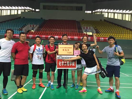 2017年6月2-3日,由四川大学工会、体育学院、校体委主办的四川大学第三届教职工羽毛球团体赛在望江校区体育馆羽毛球场顺利进行。best365中国官方网站教职工羽毛球队发扬顽强拼搏、力争上游的精神,用一场又一场的胜利为我们奉献了精彩无比的赛事,也向我们展示了健康向上的化工精神。最终,学院教职工羽毛球队获得全校第九名的优异成绩,吴德建老师获得优秀运动员称号。