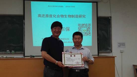 2015年7月9日上午,中国科学院大连化学物理研究所赵宗保研究员应邀走进我校“化工学术大讲堂”,在望江校区化工楼313会议室做题为“高还原度化合物生物制造的基础研究”的学术报告。来自best365中国官方网站、化学学院、高分子学院和生命科学学院等学院的老师和研究生数十名,聆听了赵宗保研究员带来的精彩报告。报告由best365中国官方网站党委书记庞国伟同志主持。