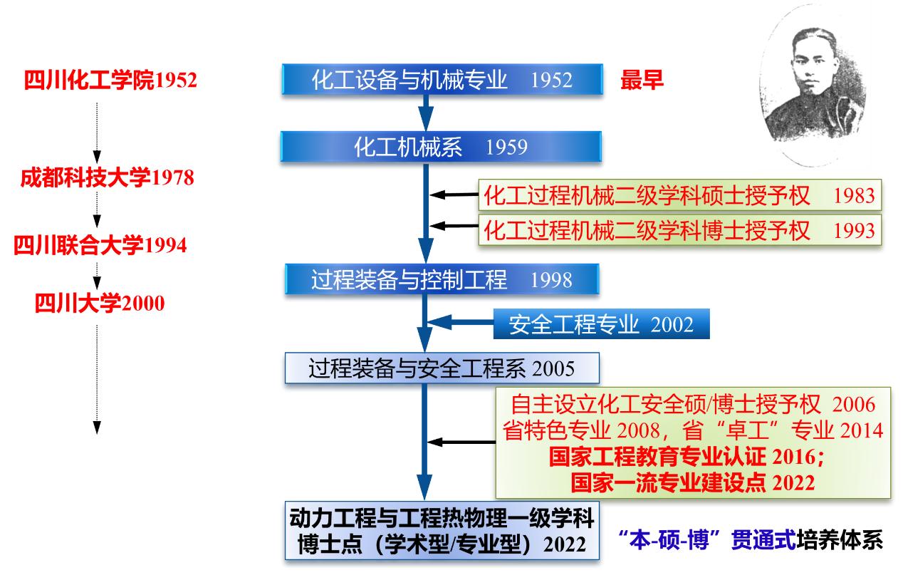 四川大学过程装备与控制工程专业始创于1952年(化工机械与装备专业,全国最早),由中国化工教育家张洪沅教授首任专业教研室主任。现为四川省特色专业,四川省重点学科,四川省卓越工程师培养试点专业,2016年通过中国工程教育专业认证,2022年获批国家一流专业建设点,2025年软科最新专业排名全国第8。专业具备动力工程及工程热物理硕、博士学位授权点,动力工程专业学位硕、博士学位授权点、安全工程硕、博士学位授权点,形成了学术型/专业型“本-硕-博”贯通式培养体系。截止2023年,已招收65届本科生,累计培养毕业生6500余人。