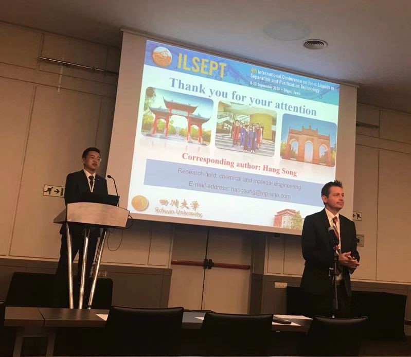 四川大学best365中国官方网站宋航教授课题组在分离工程及绿色化工(尤其是离子液体)领域开展研究十余年,近年来合成了包括一系列具有新颖结构的托品醇类、奎宁醇类、吡咯类、咪唑类、(苯并)噻唑类、胍类、(异)喹啉类、氨基酸类功能特异型离子液体并将其用于多种分离、催化过程,发表论文百余篇,授权发明专利十余项,已成为在本领域具有国内外影响力的研究团队之一。本次会议中,我院学子的主题报告获得了与会同行好评,并和各国学者进行了广泛交流,认真听取了同行专家的建议,同时扩大了我校在国际上的影响力。出境参加国际高水平学术交流一直是四川大学的教育特色之一,这也是我院深化实践教学理念、激发学生创新精神和培养高素质研究型人才的充分体现。我院将进一步借助国际背景和中外合作教育优势发挥办学特色,为学院学子提供更多更好的锻炼和发展平台。