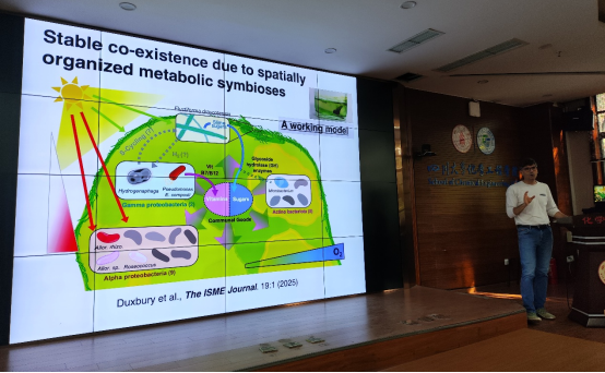 Soyer教授介绍了如何通过构建数学模型来进行细胞代谢过程的代谢溢流分析;分享了对细胞群落的组装、菌群相互影响关系、微生物的运动性和时空结构组织机制的研究进展,结合研究案例,分析了怎么从实验现象中提炼有研究价值的科学问题和科学假设。