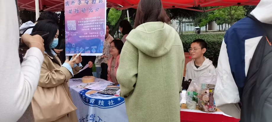 为传递红色精神、宣传先进理论、吸纳新鲜血液,2022年10月28日,“习近平新时代中国特色社会主义思想”研究会(以下简称“习新会”)在雷金凤老师指导下,各部门于青春广场c32A摊位顺利开展了新一届的招新活动。本次招新活动与“膜科学与功能材料”研究会、化学竞技社共同开展。