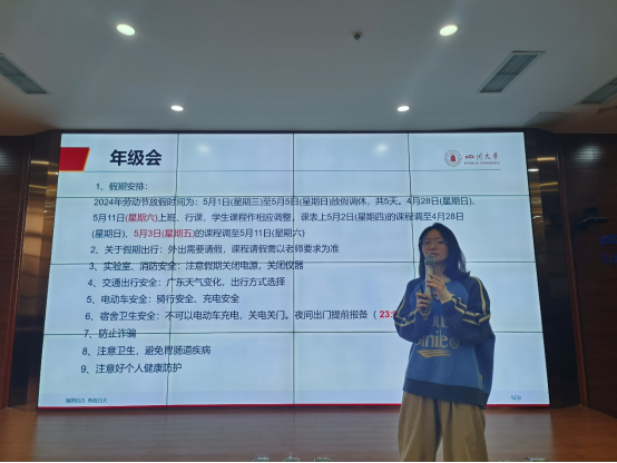4月30日上午,研究生辅导员杨秀英和邓磊分别为学院2021级和2022级硕博士研究生进行了五一假期年级会,提醒研究生假期提高自我保护意识,既要享受假期的快乐,也要确保自身的安全。