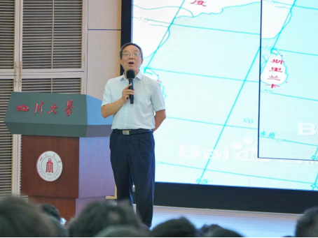 唐盛伟从成都的气候、饮食、自然与文化遗产等引入,向全体同学介绍了成都的独特风貌。他向同学们详细介绍了四川大学的校区分布、校园环境、学术排名、学校历史、杰出校友等,加深了同学们对学校的认识和认同。
