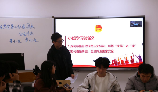 接着,王雅梅老师剖析了中美战略竞争现状。她引用已有的多种评价,指出中国经济的崛起是世界经济与政治史上的大事件,在此背景下,中美继续探寻两个大国正确相处之道的重要性不言而喻。此外,王雅梅老师还分享了中印、中日关系及中国周边地区热点问题的相关报道,强调中国正积极推进中国特色大国外交,倡导和平发展、合作共赢及构建人类命运共同体的理念。最后,全体团校学员围绕“深刻感悟新时代的历史特征,感悟‘变局’之‘变’”以及“如何借鉴历史,坚决捍卫国家安全”进行分组讨论。