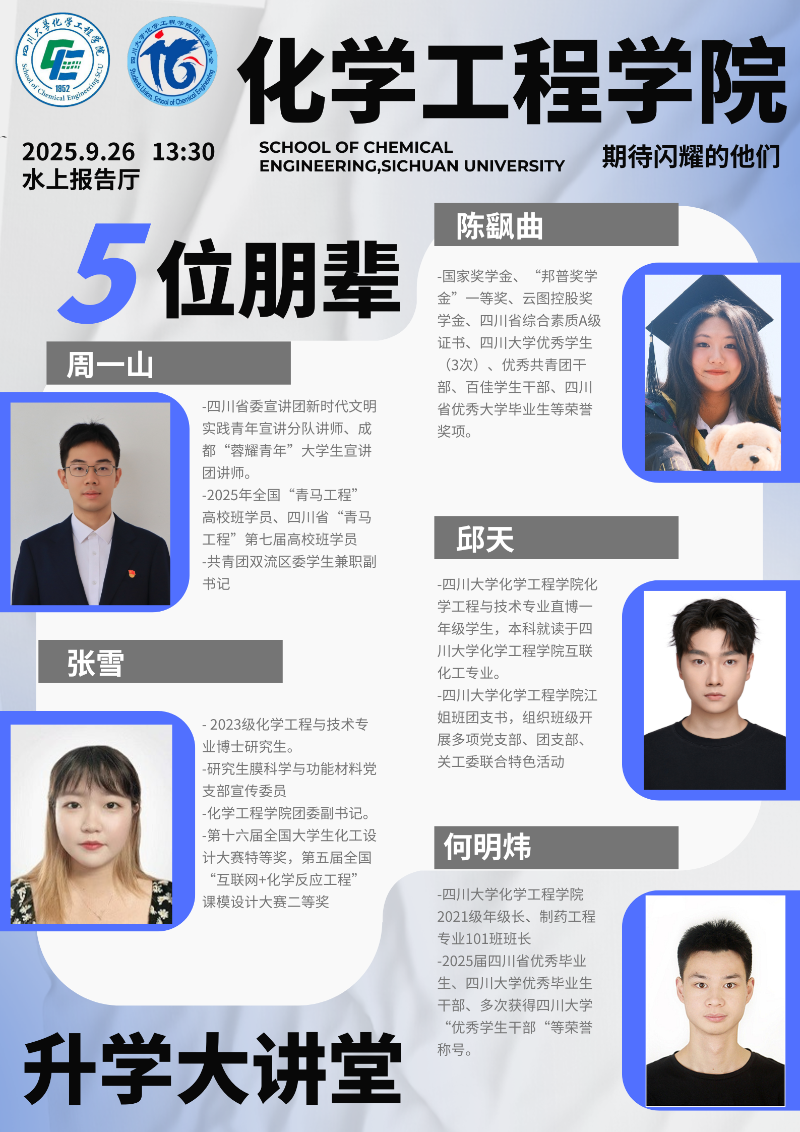 在升学大讲堂中,周一山同学以“坚定理想信念、培养核心竞争力、找到真正热爱之事”三句箴言,强调踏实学习与内心探索的重要性。张雪同学以“用四年走好一段路”为主题展开分享,为新生梳理大学四年各阶段规划安排,以实用有效的方式为迷茫学子指引方向。邱天同学以江姐班的建设为切入点,展现以“五育并举”践行青春担当的成长历程。何明炜同学结合自身经历,以“思考与实践结合”的主动探索模式来解锁大学生活多元发展可能。陈飖曲同学从绩点提升、竞赛参与、实验技能培养到保研规划等方面,提供了一份干货满满的“成长地图”。