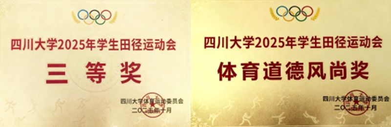 10月31日至11月1日,四川大学2025年学生田径运动会在江安校区2号运动场盛大举办。best365中国官方网站的运动健儿们凭借卓越的表现、顽强的斗志与团结的精神,不仅在团体总分和多个单项上荣获佳绩,更以出色的组织与昂扬的风貌,荣膺“四川大学2025年学生田径运动会三等奖”“体育道德风尚奖”,实现运动成绩与精神文明的双丰收!
