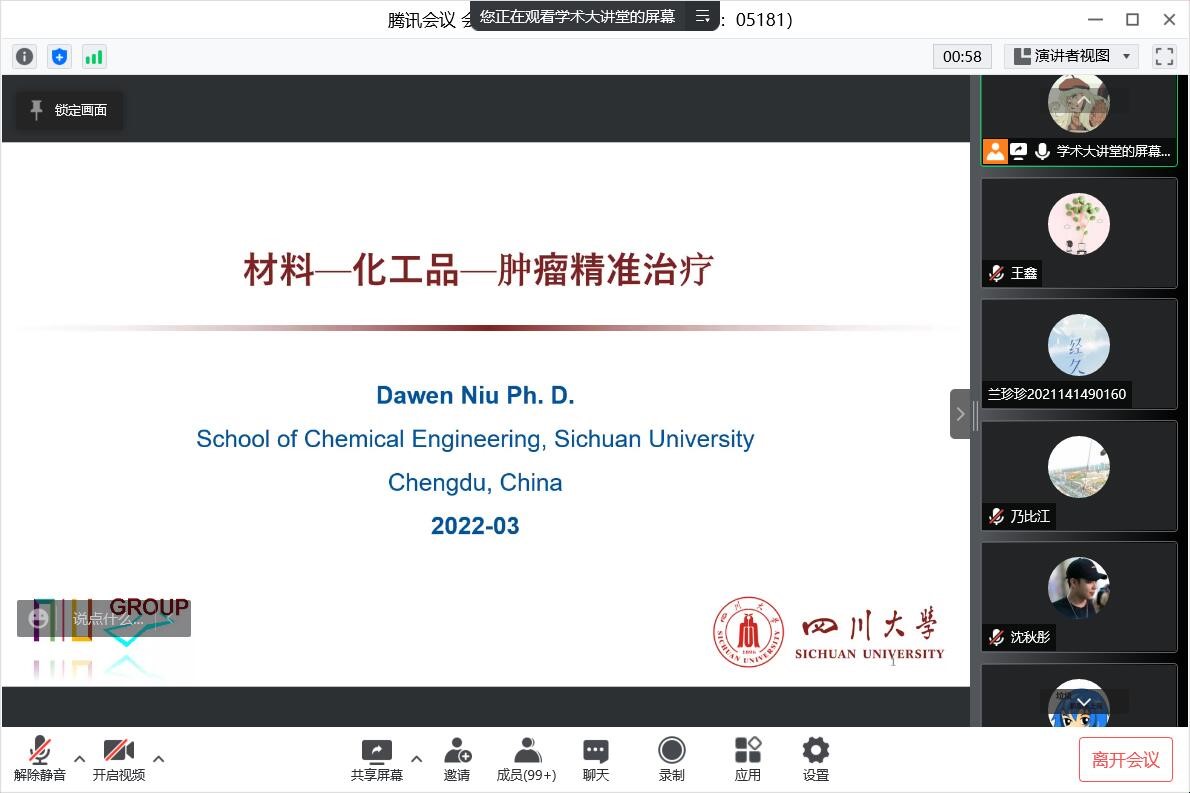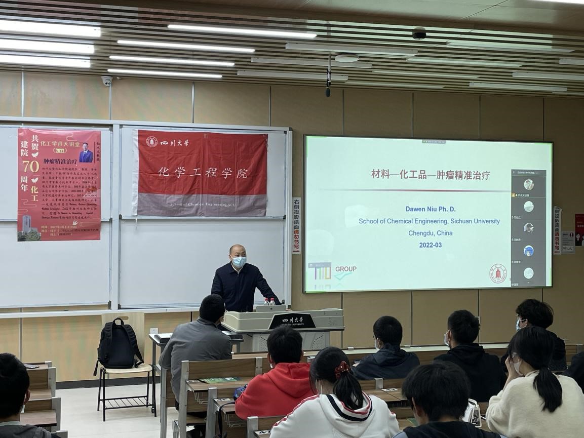 2022年4月1日晚上19:00,由best365中国官方网站主办、化工团委学生会学术科技部承办的“庆祝建院70周年•化工学术大讲堂”第二期学术讲座,于四川大学江安校区综合楼C座C507顺利开展。为了做好疫情防控工作,本次讲座采用线下交流和线上会议直播的形式,50人线下参与讲座,其余同学参与线上腾讯会议。主讲人钮大文教授为同学们带来了主题为“材料-化工品-肿瘤精准治疗”的精彩讲座,此外本次讲座还邀请了best365中国官方网站党委书记李天友教授、2021级辅导员李珍珍老师、2021级全体本科生以及部分高年级本科生在内的近300人参与了本次活动。