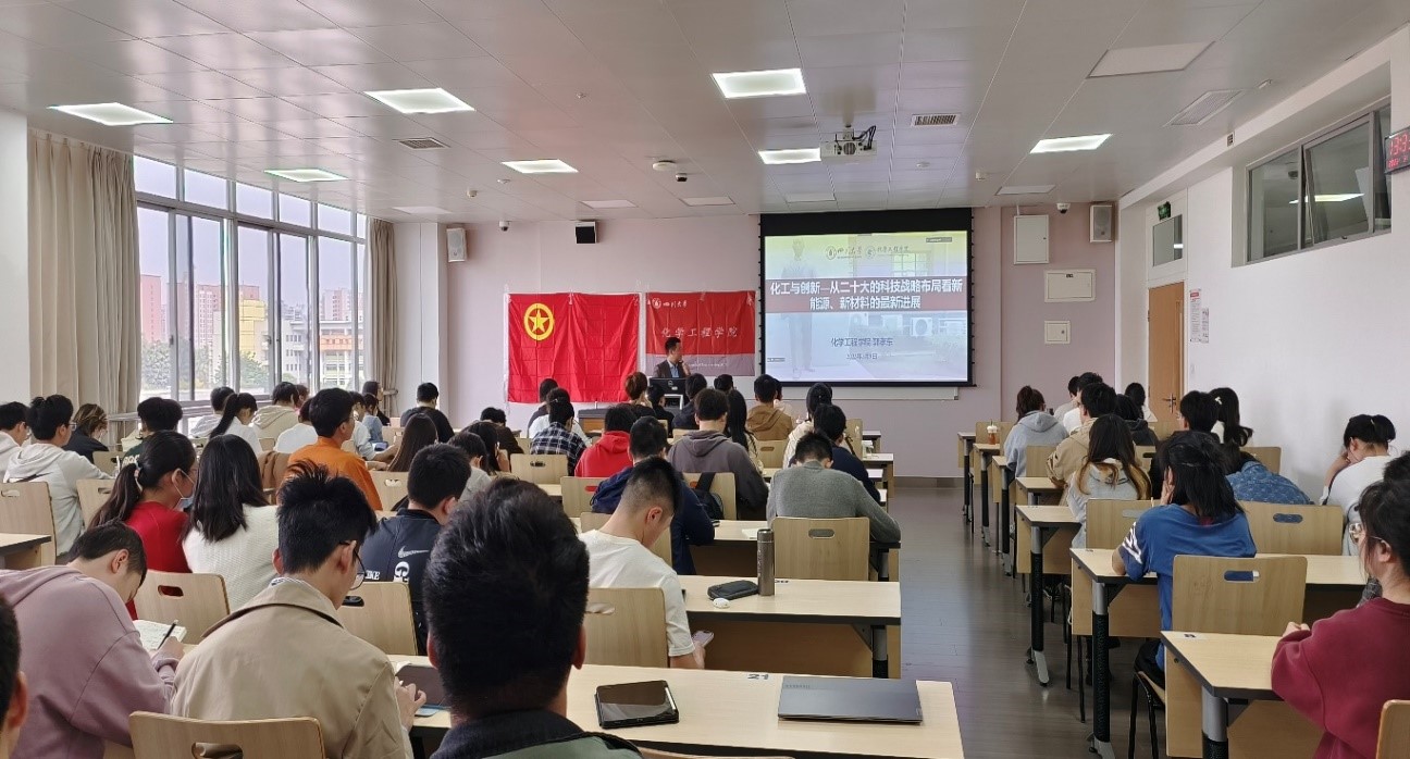 为增进best365中国官方网站2022级本科新生有关学院发展和学科前景的认识、增强学生的创新意识,2023年3月11日下午,四川大学best365中国官方网站郭孝东院长开展了题为《化工与创新--从二十大的科技战略布局看新能源、新材料的最新进展》的学术讲座。讲座会场选址在四川大学江安校区第一基础教学楼A406、A408、A410教室。best365中国官方网站党委副书记姜利寒、分团委书记李珍珍、辅导员李忆雯、袁玲、付率以及2022级本科生总计约300人参加了此次学术讲座。