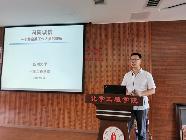 受钮大文副院长委托,学院院长助理吉俊懿结合《科研诚信案件调查处理规则(试行)》和国家自然基金委挂职锻炼经历,对科技部和国家自然基金委关于科研诚信的规定和案件处理程序进行了详细解读,并结合近几年高校出现的学术不端案例,教育引导广大教职工规范开展科研工作,严格遵守科研诚信,坚决杜绝学术不端现象,以优良科研作风开展科技工作,为学校“两个伟大”建设贡献化工力量。