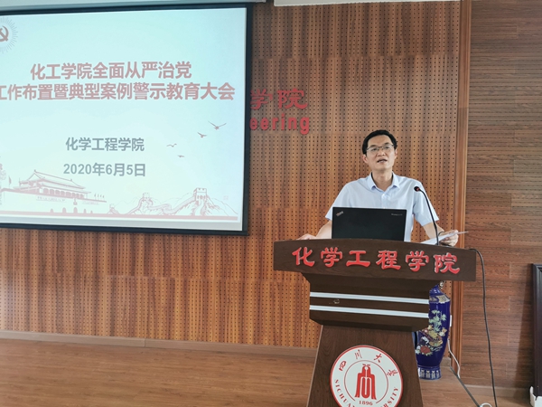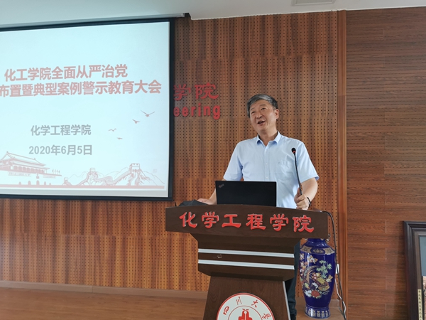 会议认真学习《党委(党组)落实全面从严治党主体责任规定》并对学院2020年全面从严治党工作进行了布置。庞国伟书记向全体与会成员传达了学校2020年全面从严治党工作视频会精神,并详细解读了学院2020年全面从严治党工作要点。他说到,全院教师要一以贯之、坚定不移全面从严治党,强化对权力运行的制约和监督,保证党的路线方针政策和学校重大决策部署贯彻落实,为坚决打赢疫情防控阻击战,奋力推进中国特色、川大风格的世界一流大学建设和一流化工学科建设提供坚强保障。