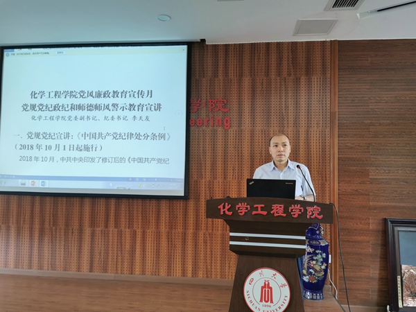学院党委副书记、纪委书记李天友开展了党规党纪和师德师风警示教育。李天友副书记从《条例》颁布的背景、适用人群、增加条款等方面解读了《中国共产党纪律处分条例》,并指出新修订的《中国共产党纪律处分条例》最鲜明特点就是突出政治性,把坚决维护习近平总书记党中央的核心、全党的核心地位,坚决维护党中央权威和集中统一领导作为出发点和落脚点。全院教职工要进一步提高政治站位,严格遵守政治纪律和政治规矩,党员干部要带头遵守党规党纪,使党的纪律成为管党治党的尺子和全体党员的行为底线。随后,李天友副书记对带领大家一起学习了《新时代高校教师职业行为十项准则》《四川大学教职工师德师风规范》和《四川大学教职工师德失范行为处理办法(试行)》,并对近年来教育部、中纪委和部分网站披露的违反党规党纪和师德师风典型案例进行了学习。他强调,学院严格执行“师德师风”一票否决制,身为教师,应贯彻党的教育方针,忠诚党和人民的教育事业,树牢“四个意识”,践行“四个自信”,为人师表,关爱学生,把立德树人作为中心环节,坚持教书与育人并重,帮助学生树立正确的世界观、人生观、价值观。