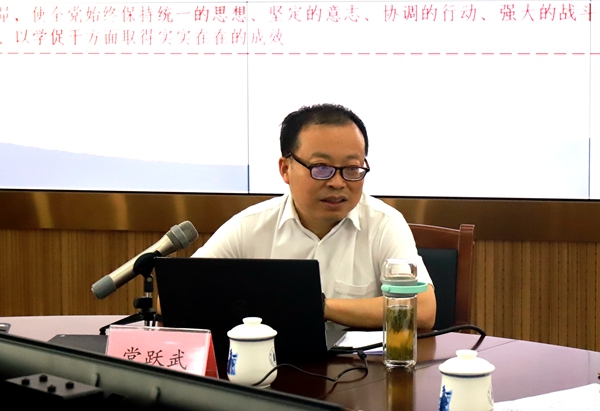 党跃武作《胸怀“国之大者”,善谋“党之大计”——学习贯彻党的二十大精神,着力造就拔尖创新人才》专题辅导。他指出,学习贯彻习近平新时代中国特色社会主义思想对于落实立德树人根本任务,着力造就拔尖创新人才具有重要意义,我们要贯彻落实好党的二十大报告关于教育、科技、人才的重要论述,以此指导实践、推进高质量人才培养。党跃武理论联系实际,从川大化工发展历史、川大本科教育2.0行动计划和着力开展有组织的本科教育等几个方面对四川大学拔尖创新人才培养的思路和举措进行全面细致的讲解。谈到本科人才培养,他说到,我们要深入贯彻落实党的二十大精神,扎实开展学习贯彻习近平新时代中国特色社会主义思想主题教育,牢记为党育人、为国育才,充分认识到新时代本科教育面临的新任务、新要求、新挑战,推进“就业深造-招生改革-人才培养”多元一体联动机制改革,着力培养德智体美劳全面发展的本科拔尖创新人才。